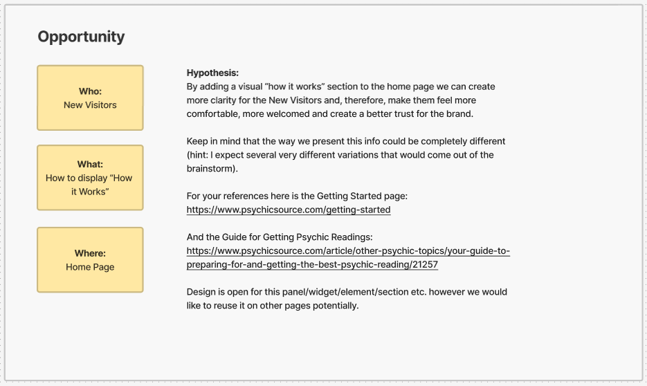 Hypothesis:Â Adding a visual “How It Works” section to the New Visitor Psychic Source home page will create trust for the brand and convert more users. Clear, actionable steps to get a psychic reading makes the user feel more comfortable and welcomed.